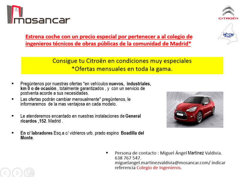 José Luis Rubio Campos, director Financiero de Mosancar, concesionario oficial Citroën y DS, ha firmado con el decano de la Zona de Madrid, Alejandro Alañón, un convenio que servirá para beneficiar a los colegiados interesados con ventajas y condiciones especiales.